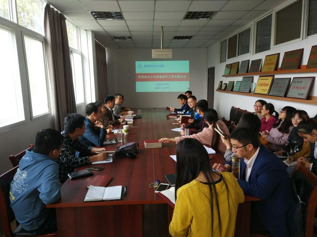 本网讯(信息技术学院 马士君)为全面落实教育部党组《高校思想政治工作质量提升工程实施纲要》,进一步将贯彻落实全国高校思想政治工作会议精神引向深入,根据学校党委安排部署,10月17日下午2:30,信息技术学院在行政楼304会议室组织全体教职工集中学习了《安徽省国防科技职业学院思想政治工作质量提升工程实施方案》(校党〔2018〕113号)。会议由信息技术学院党总支副书记杨庆颖主持。
