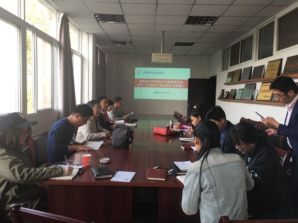 本网讯(信息技术学院 马士君)为全面贯彻落实从严治党的主体责任,以对党的事业和党员高度负责的精神,使党的纪律刻印在全体党员的心上,真正转化为党员干部的日常习惯和自觉遵循,10月31日下午16:00,信息技术学院在行政楼304会议室组织全体党员教职工集中学习了《中国共产党纪律处分条例》。会议由信息技术学院党总支副书记杨庆颖主持。