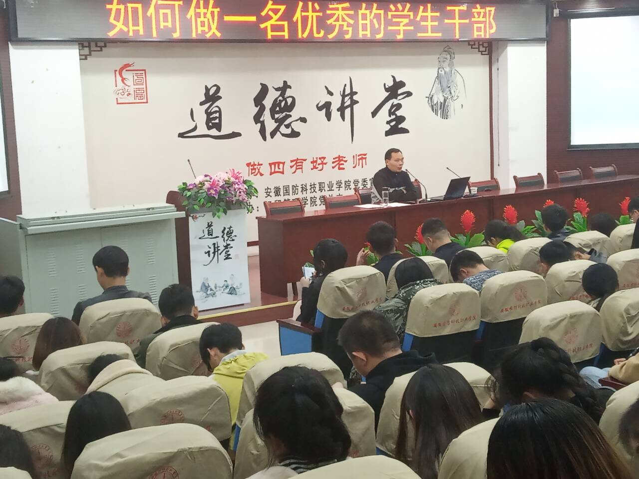 经过前期在广大学生干部中调研分析,根据学生干部实际,2018-2019学年学生干部培训采取“套餐+点餐”式培训模式,即就大多数学生干部共同的培训需求以专题讲座方式开展,对于少数学生干部的个别培训需求以讨论、小组学习、素质拓展等形式开展。此次学生干部集中培训先后开展了主题为“高效学习方法及技巧”、“如何提高学生干部宣传能力”、“如何做一名优秀的学生干部”及“六安红色文化及军工魂精神解读”的主题讲座,分别由团总支书记付玉梅老师、院党总支副书记刘峰老师和辅导员许凤麟老师担任主讲人。
