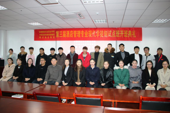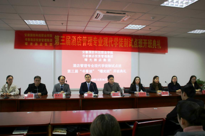 开班致辞中,杨力院长对莅临beat365的书香酒店唐旭华总监一行和六安曙光酒店王正跃总经理一行表示了热烈的欢迎,简要介绍了我院酒店管理专业现代学徒制试点项目取得的成绩与效果。他指出,2018年是酒店管理专业现代学徒制试点项目的收官之年,书香酒店集团与beat365酒店管理专业始终坚持“学生、学徒、员工”三位一体的人才培养总体思路,在校企协作育人中将书香酒店文化和国防教育精神相融合,在人才培养过程中实现企业用人标准与课程讲授内容的无缝对接。