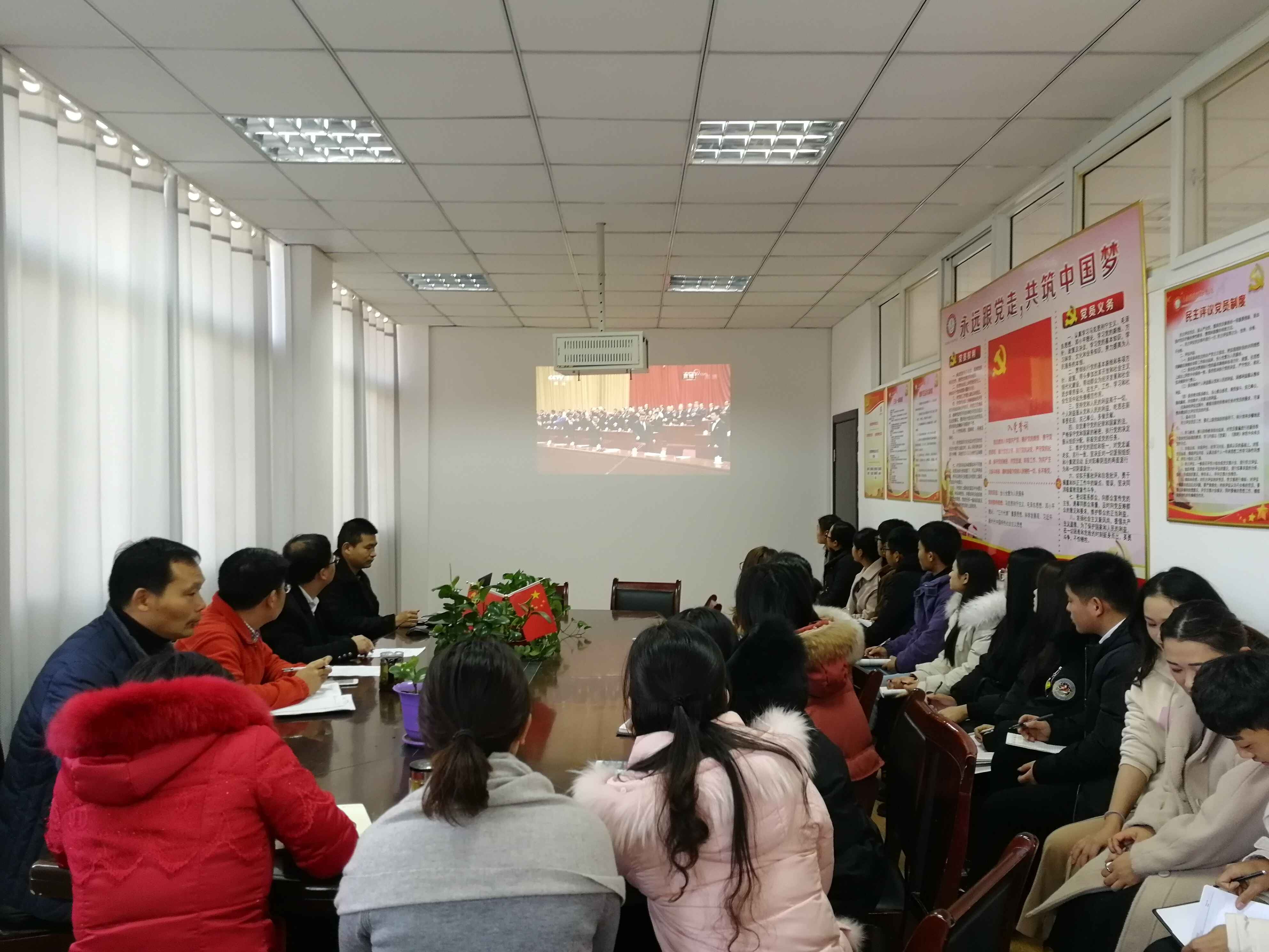 上午9时50分,学院坐班老师及学生代表共30余名成员在办公楼二楼会议室集中,统一收看直播。有教学任务的教师充分利用信息化手段,以“课堂三分钟”的形式组织学生收看。未集中收看的师生利用办公室电脑、教室多媒体、手机客户端设备等收看大会直播。
