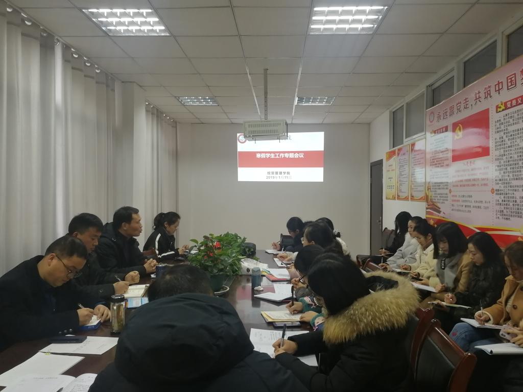 本网讯(经贸管理学院 许凤麟)为做好寒假学生管理和安全教育工作,经贸管理学院于1月11日下午在院会议室召开了寒假学生工作专题会议。学院党总支书记杜先扬、副书记刘峰及全体班主任参加了此次会议。会议由刘峰主持。