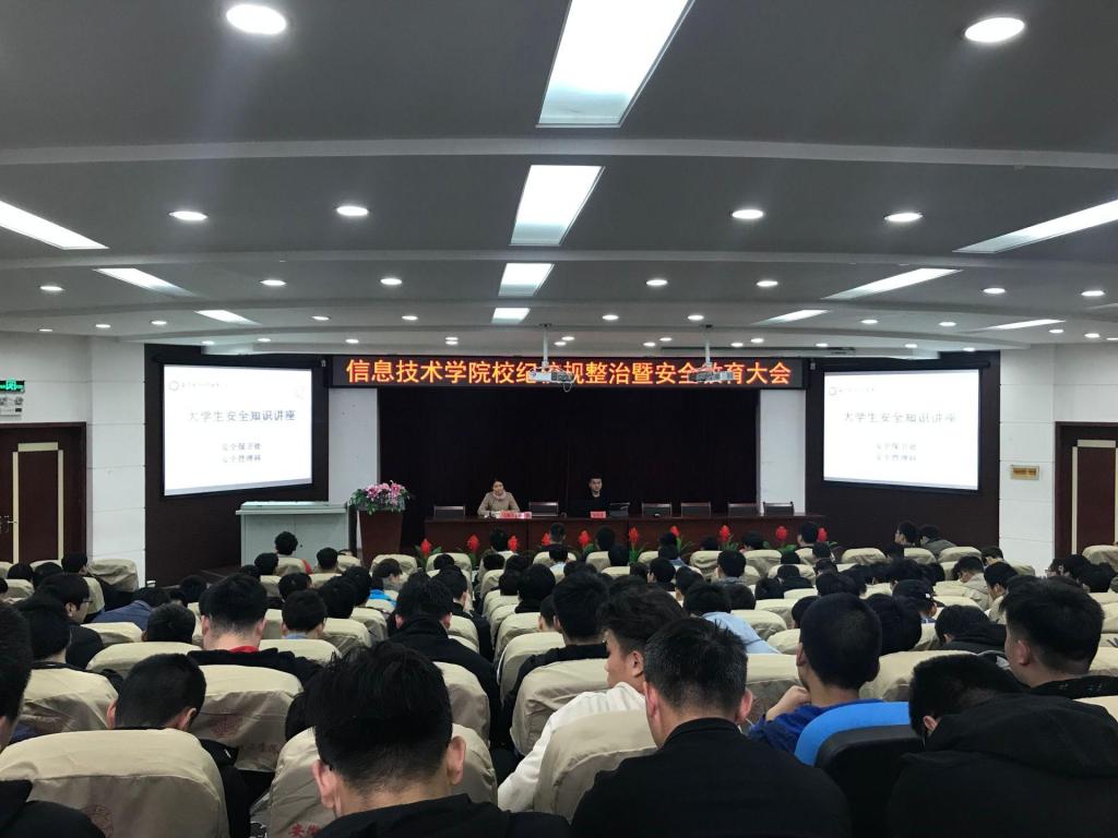 本网讯(信息技术学院 马士君)为进一步增强学院学生的组织纪律观念和安全意识,规范学生日常行为,强化学生养成教育,4月10日下午16:00,信息技术学院在图书馆报告厅组织召开了校纪校规整治暨安全教育大会。会议邀请了学校安全管理科科长杨振亚作专题讲座,17级、18级全体男生参加。会议由院党总支副书记杨庆颖主持。