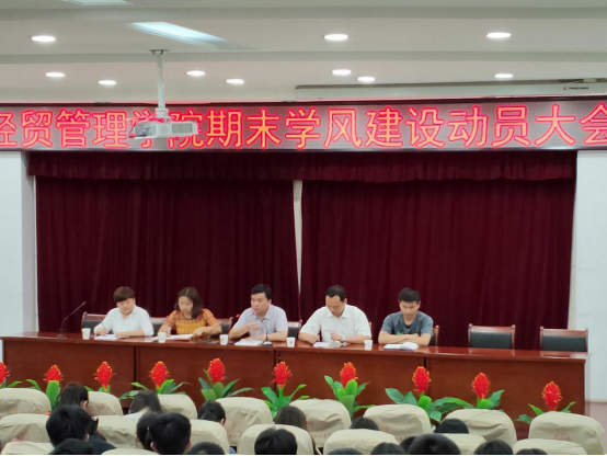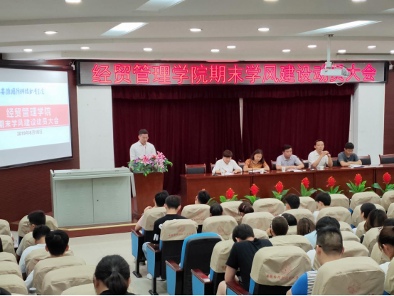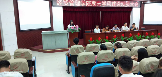 本网讯 为营造良好的学习氛围,形成积极向上的校园文化,经贸管理学院于6月10日晚在图书馆报告厅开展经贸管理学院期末学风建设动员大会。经贸管理学院党总支书记杜先扬、党总支副书记刘峰、辅导员许凤麟、张锐老师及学院200位学生代表出席,会议由经贸管理学院团总支书记付玉梅主持。