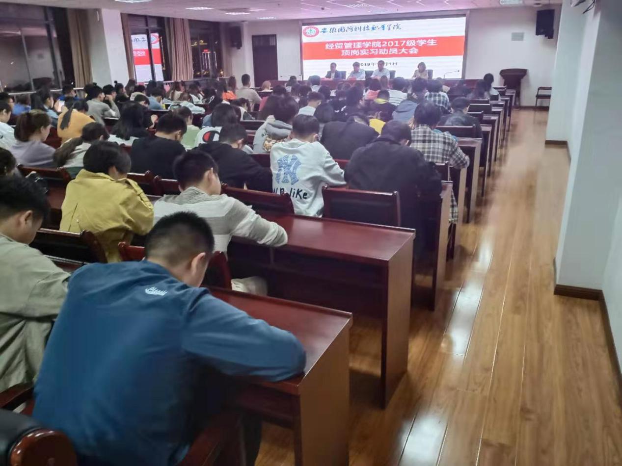 本网讯(经贸管理学院 陈玮)为了帮助同学们树立正确的顶岗实习观念,顺利完成顶岗实习任务,进一步促进经贸管理学院毕业生顶岗实习和就业工作,经贸管理学院于11月1日晚19点整,在秉心楼12楼会议室召开了2017级学生顶岗实习动员大会。经贸管理学院党总支书记杜先扬、院长杨力、副院长杨学分,毕业班班主任、辅导员及经贸管理学院2017级全体毕业生参加了大会,会议由办公室主任张圣霞主持。
