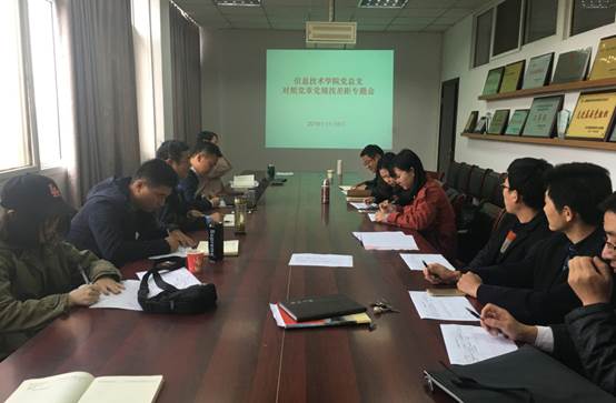 本网讯(信息技术学院 戴泽淼)11月6日,为贯彻落实习近平总书记的重要指示精神,信息技术学院党总支召开对照党章党规找差距专题交流研讨会议。会议由党总支副书记杨庆颖主持,软件党支部和网络党支部全体党员出席了此次会议。