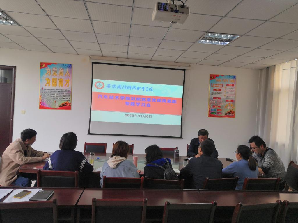 本网讯(汽车技术学院 戴柳)按照学校“不忘初心、牢记使命”主题教育安排部署,2019年11月6日下午,汽车技术学院党总支在知行楼416会议室召开对照党章党规找差距专题会。会议由第一支部书记戴柳主持,全体职工党员参加。