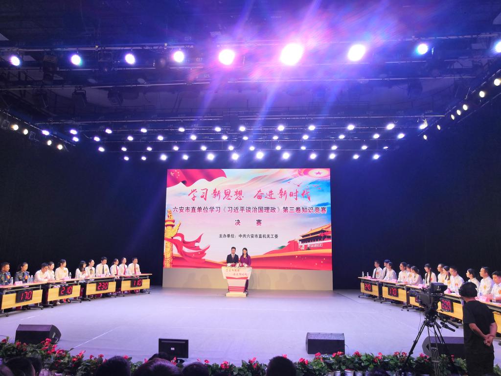 本网讯(思政部 戴柳)9月11日,由六安市直机关工委主办的“学习新思想 奋进新时代”学习《习近平谈治国理政》第三卷知识竞赛决赛在市广播电视台演播大厅举行。beat365马克思主义学会指导老师戴柳、学会会长李言、学会成员何顶军全程观摩了此次比赛。