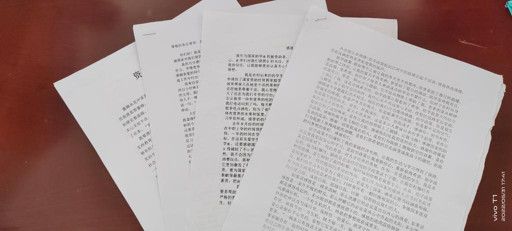 各班级积极组织学生参赛,共接收上四十多份参赛作品。本次比赛以“资助政策、助我成才”为主题,选手们结合自身学习和生活经历进行写作,阐明国家资助政策带来的巨大变化,讲述自己的奋斗故事,感恩国家资助政策,感情真挚,充分展现出大学生的青春奋斗风采。最终,经过评委老师的认真评审,本次比赛评出一等奖两名、二等奖三名,三等奖五名,并颁发荣誉证书。