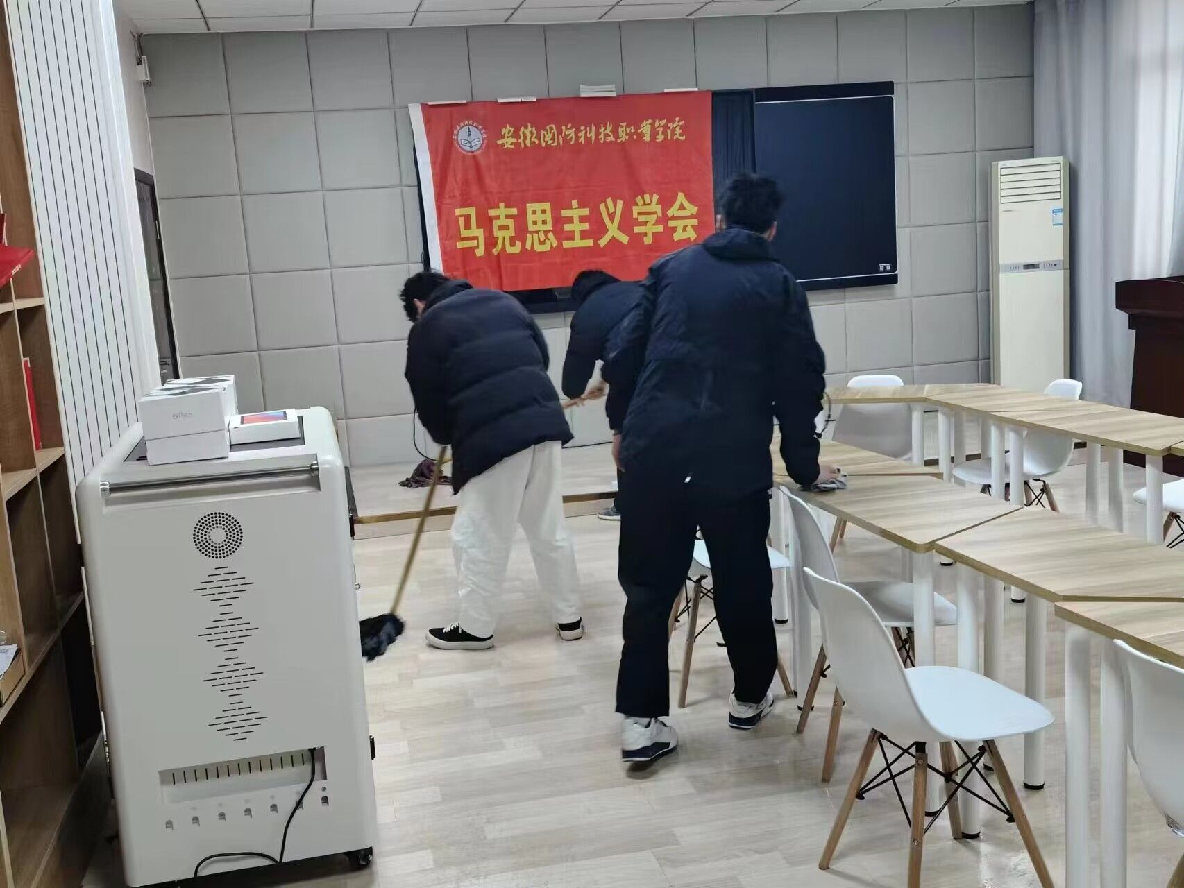 学会全体成员携带清洁工具、消毒物品来到了知行楼五楼“袁旗名师工作室”、马克思主义学院会议室。首先,学会负责人周子豪向大家说明了分工和注意事项。接着,学会成员开始有条不紊的打扫地面卫生、擦拭会议室办工桌台面、整理储物柜等。