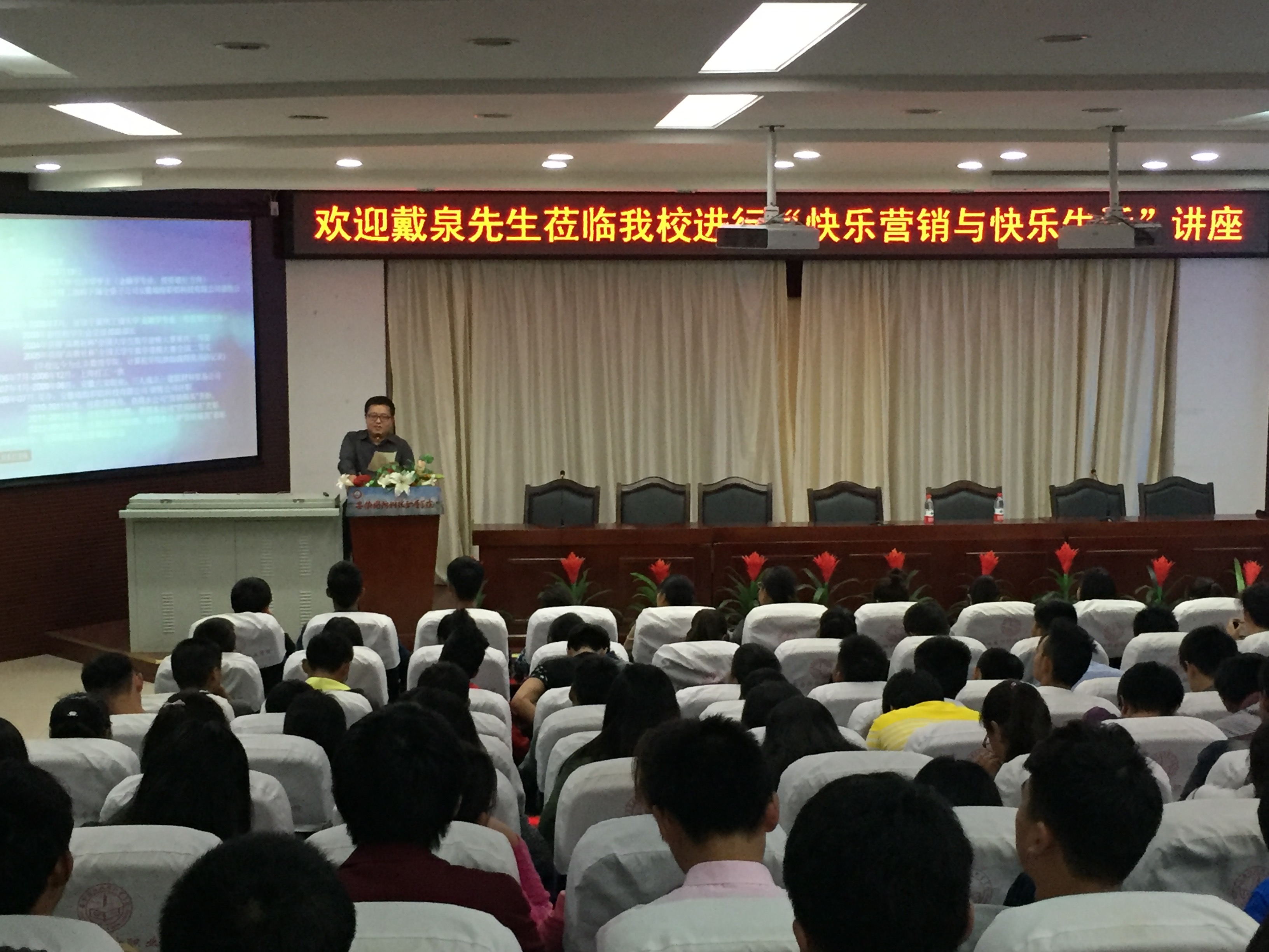 2015年10月23日16点,管理工程系和院团联大学生营销策划协会在图书馆报告厅成功举办“快乐营销与快乐生活”知识讲座。讲座邀请了安徽墙煌彩铝科技有限公司销售副总监戴泉主讲,管理工程系李文君主持,来自全院的300多名师生参加了本次营销知识讲座。