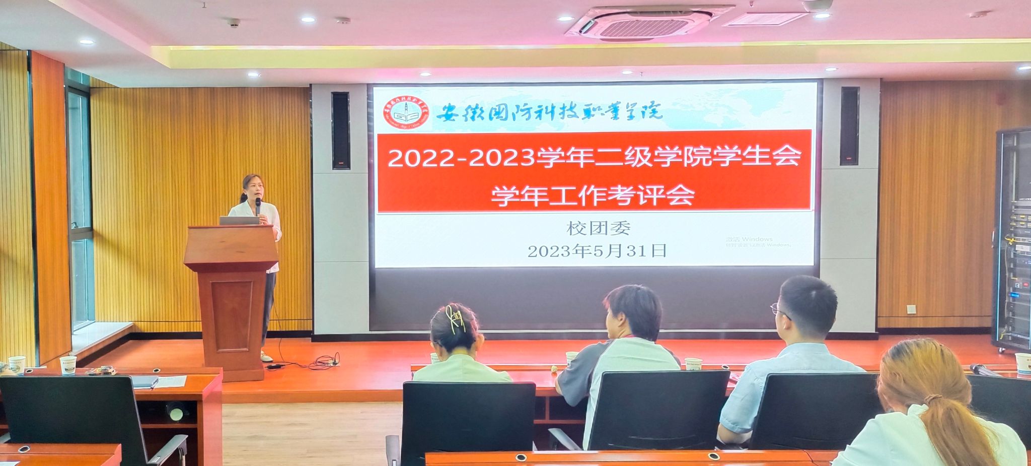 第二阶段,5月31日下午,校团委在产教融合基地第一报告厅组织召开了2022-2023学年度二级学院学生会定性考评会。校团委副书记张凤、二级学院团总支书记、团委老师、校院级两级学生会主席团成员出席本次会议。在本次考评会上,各学院按抽签顺序依次上台汇报,针对学生会作用发挥情况、岗位职责履行情况、工作计划完成情况、学生科技文化艺术活动开展情况等四个方面,全面总结了年度工作。考核组本着“公平、公开、公正”的原则,按照评分标准对其进行现场评分,填写评分表。结合前期定量考核成绩、现场定性评议成绩及同学满意度测评成绩汇总,校团委评选出2个年度优秀学生会。