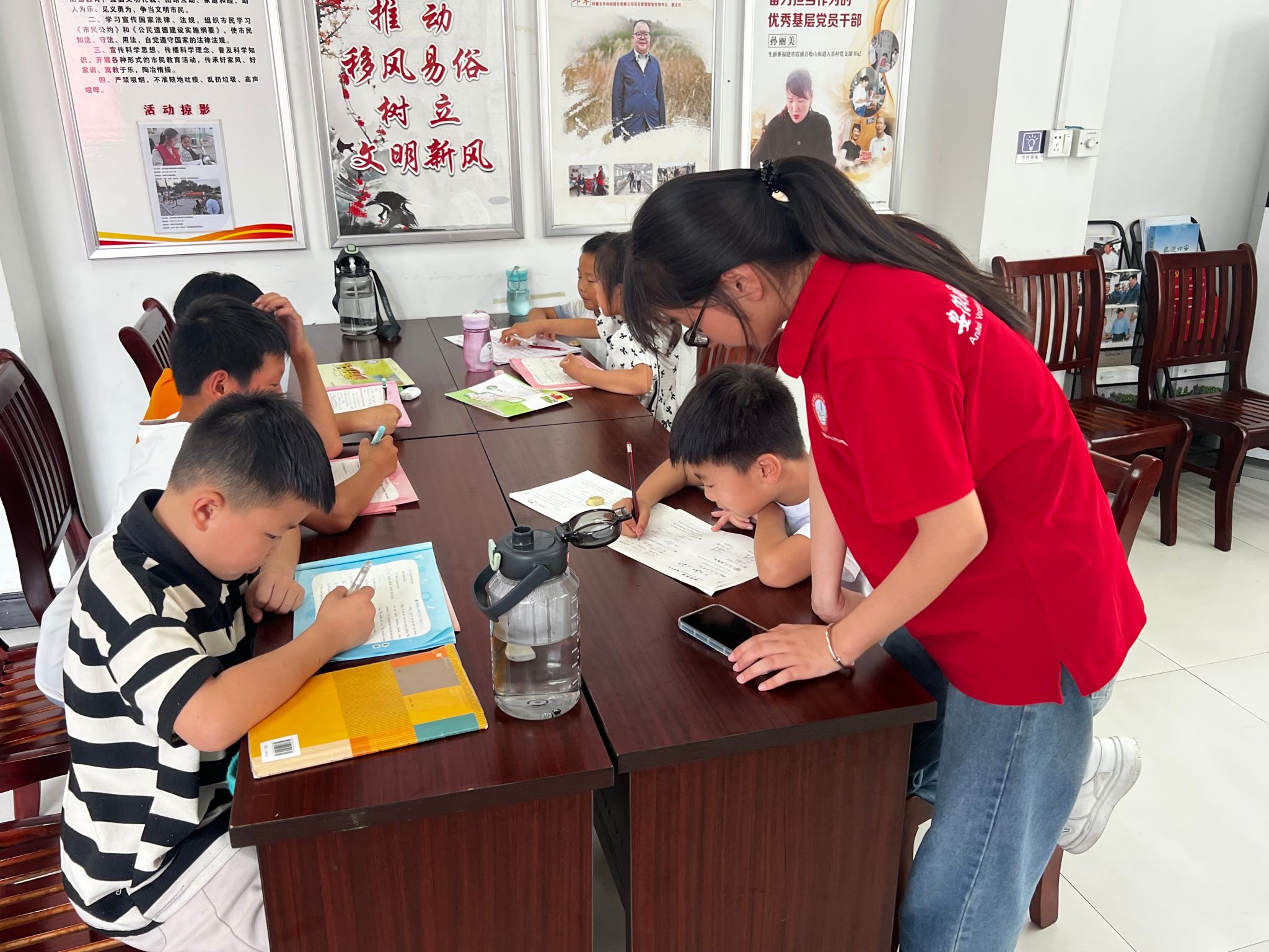 不少家庭在暑假面临孩子看护难问题。为此,校团委星火乡村暑期社会实践团依托叶南村少儿成长驿站针对全村有需求的适龄少年儿童开展课外辅导志愿服务。驿站辅导班在同学们的参与中开展得如火如荼,大学生志愿者们讲得耐心细致,孩子们也听得认真,徜徉在知识的海洋里,脸上洋溢着对知识的渴求和对未来的美好向往。