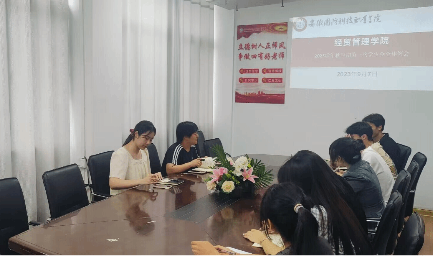 本网讯(学生通讯员 孙涵涛)近日,经贸管理学院在知行楼会议室召开新学期团总支学生会第一次工作例会。团总支李亚男老师主持会议并布置本学期各项团学工作,团总支学生会全体成员参加。