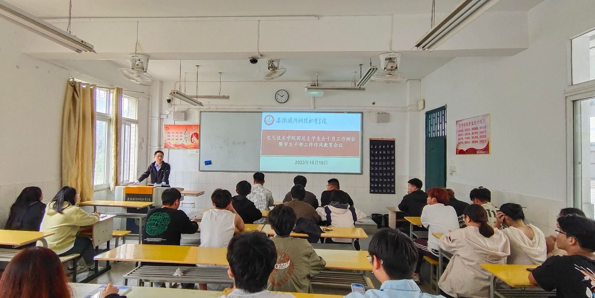 本网讯(电气技术学院 陈俊)为捋顺工作思路,全面贯彻落实学校各项工作要求,规范团总支学生会学生干部工作纪律,营造良好的工作作风,10月10日中午,电气技术学院团总支学生会在2号教学楼102教室组织召开学院团总支学生会十月工作例会暨学生干部工作作风教育会议。会议由学院团总支书记陈俊主持,团总支学生会全体学生干部参加。