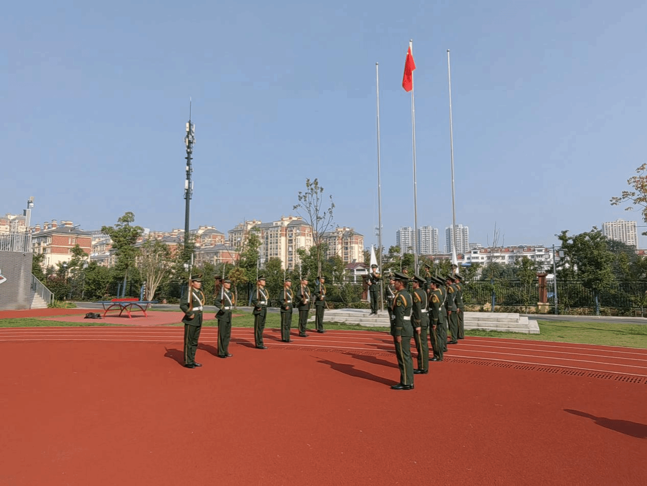 上午九点,旗手和护旗方队迈着铿锵有力的步伐,护送国旗走向升旗台。全场每个人都面向国旗庄严敬礼,表达对祖国的祝福和挚爱之情。