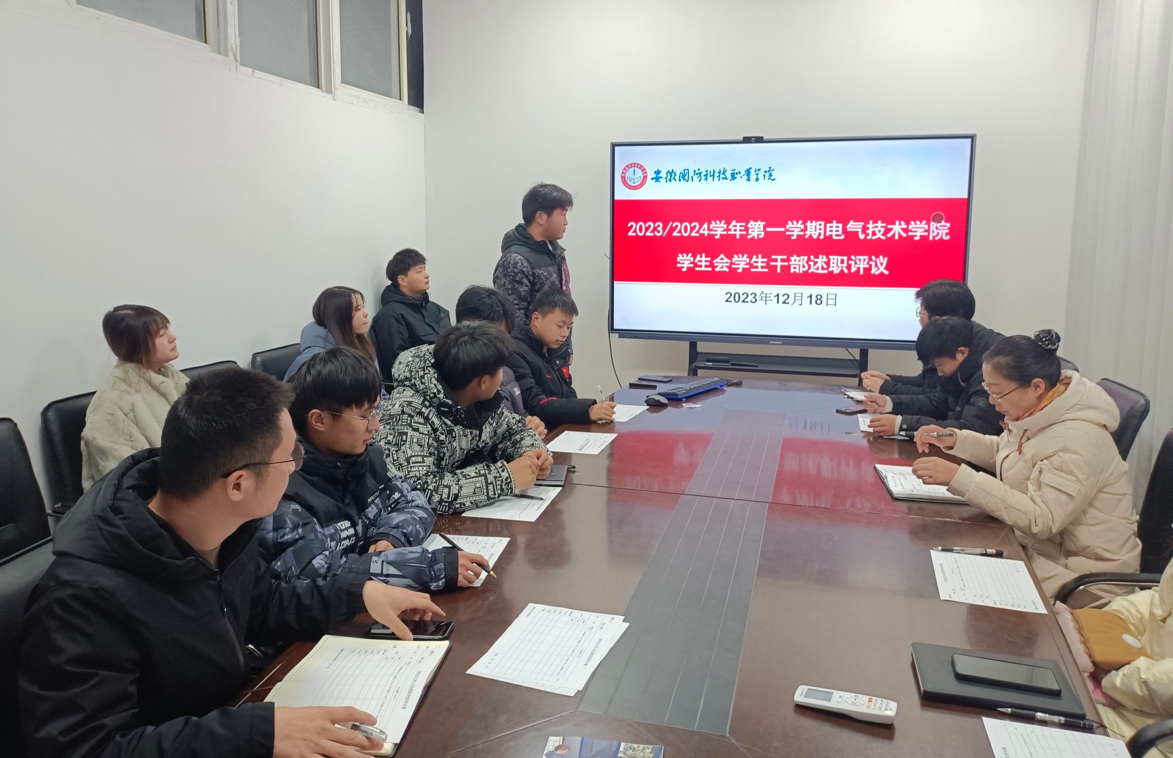 本网讯(电气技术学院 陈俊)为贯彻落实《关于推动高校学生会(研究生会)深化改革的若干意见》(中青联发〔2019〕9号)有关要求,进一步加强对学生会组织工作人员的管理和监督,全面准确地掌握学生干部的工作情况,提高学生干部的责任意识、服务意识和大局意识,12月18日晚,电气技术学院学生会工作人员2023-2024学年第一学期述职评议工作在知行楼102会议室顺利开展,电气技术学院党总支副书记张丽、团总支书记陈俊、辅导员纪远、吴泽建、申晓伟、王星星、卢明瑞和10名学生代表作为此次述职评议评委。