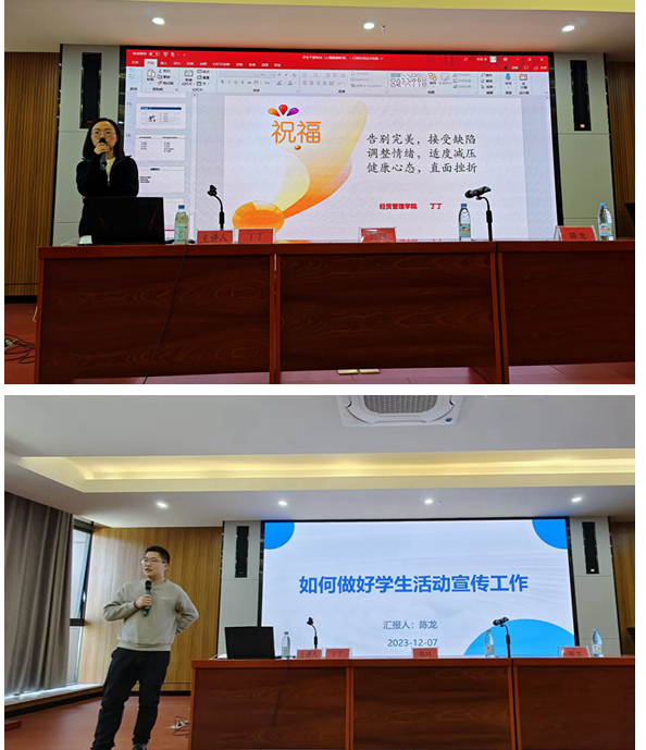 本次团学干部培训采用集中培训和户外素质拓展两种方式同时进行。集中专题培训共有五个专题,第一场从《团学干部如何做好心理健康工作》拉开序幕,学院专职辅导员丁丁老师向学生干部讲述心理健康的相关知识。她从“心理健康及其标准”、“心理问题及其类型”、“大学生常见心理问题及原因分析”、“解决大学生心理问题的策略和方法”四个方面展开此次培训活动。丁丁老师提出,心理健康主要由智力、情感、意志品质、人格、自我意识、人际关系和社会协调七个方面组成。青年团学干部需要做到这七个方面的协调统一,按照大学生心理健康标准严格要求自己,及时发现自身可能存在的心理健康问题并优先解决。