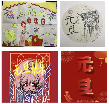 本次活动以“庆元旦”为契机,引导学生展现自己的风采,将自己在课堂所学习到的知识运用到实际生活中。海报创作要求具有较为统一的风格特色,要具有创新性,艺术性,校园性。参与者们充分发挥自己的想象力和艺术才华,通过各种形式的艺术手段,如绘画、PS制作等,将元旦的欢乐和祝福融入海报中。海报上选用的色彩方案、字体样式和元素描绘都充满了青春活力,给人焕然一新的感觉。
