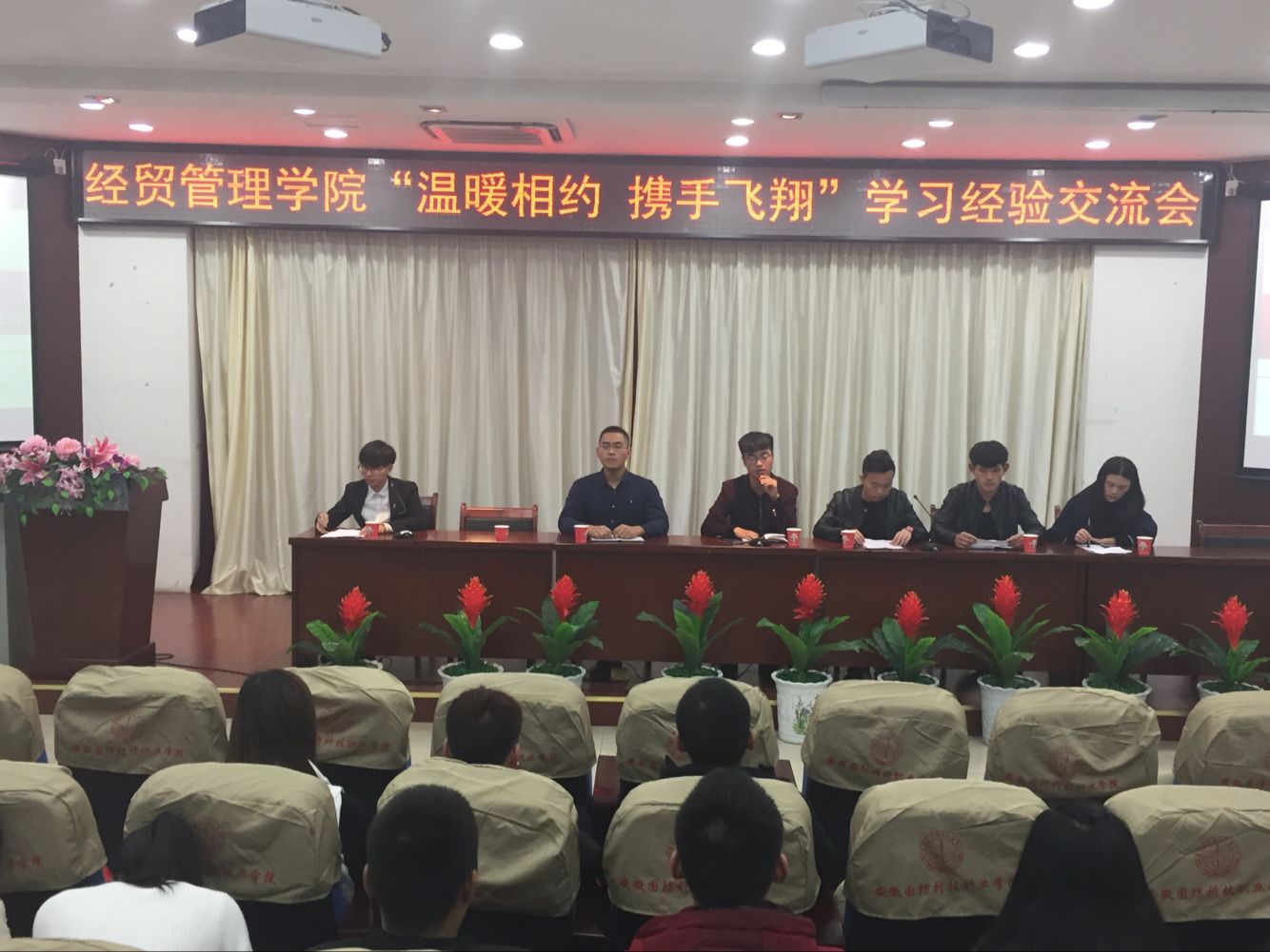 为促进我院新老生之间的交流,2017年11月14日晚经贸管理学院在图书馆报告厅举办了以“温暖相约,携手飞翔”为主题的学习经验交流会,会议由赵玖同学主持。院学生会主席高鹏程,团总支副书记周金亮,学生会副主席赵归,社团主席李翔,优秀学生代表缪琴琴以及团总支学生会主要学生干部和17级全体新生参会。