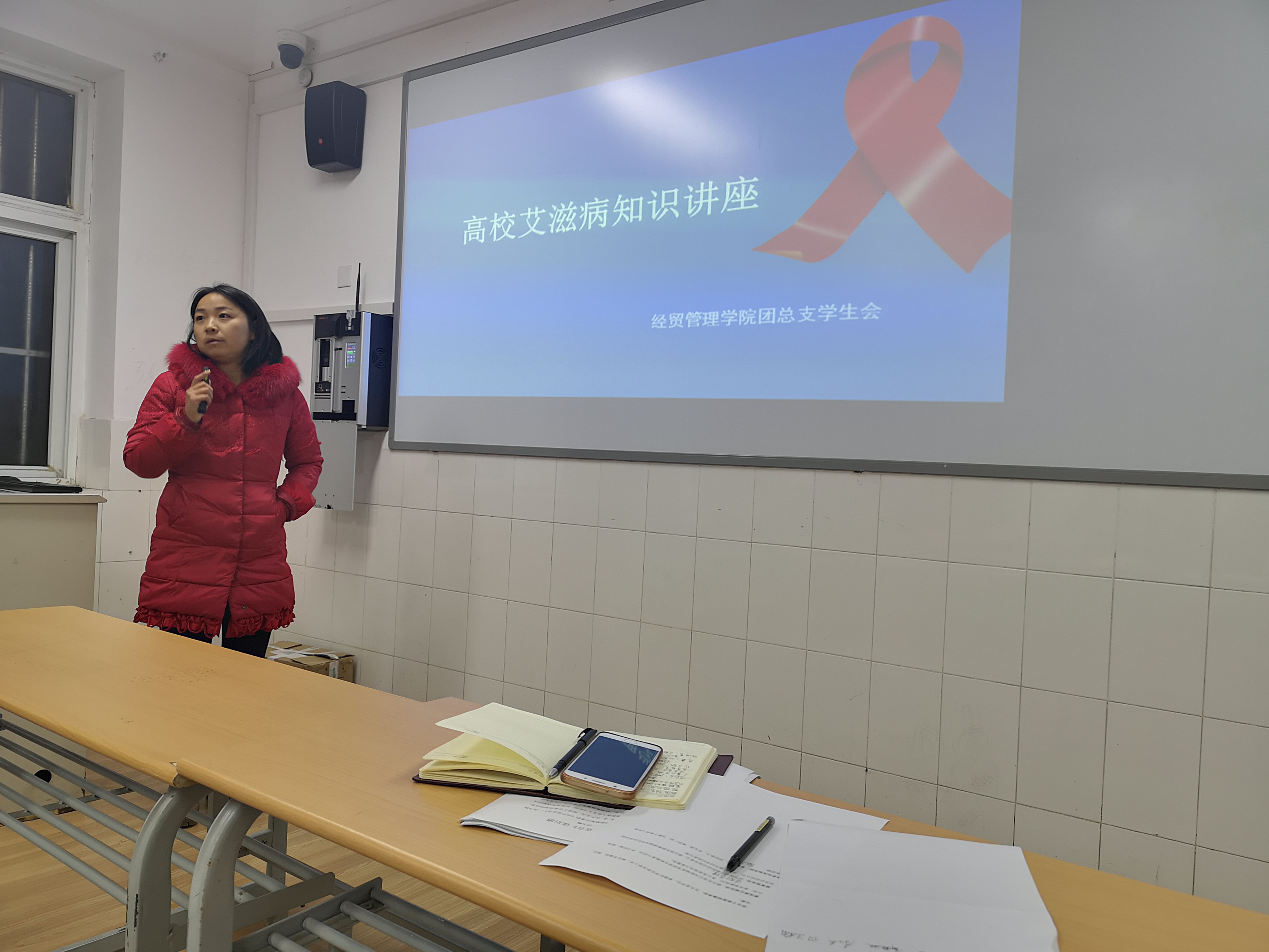 本网讯(经贸管理学院 付玉梅)为了普及高校大学生防控艾滋病知识,增强经贸管理学院团学干部自我保护意识,经贸管理学院团总支在12月12日下午一教102教室举办预防大学生艾滋病防控知识讲座,由经贸管理学院团总支书记付玉梅老师主讲,团总支学生会主要学生干部及院属5个专业性社团负责人共40位同学参与此次讲座。