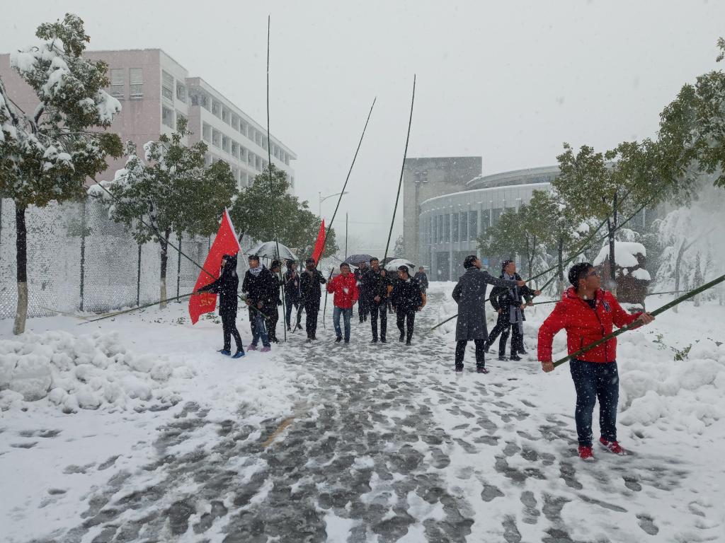 本网讯(经贸管理学院 付玉梅)六安1月3日迎来入冬以来的第一场降雪,美丽的校园裹上一袭“银装”,为国防师生的学习与生活平添了许多乐趣与色彩。但降雪也同样给师生出行造成了不小的麻烦与不便,同时积雪也压断了学校部分景观树,积雪妨碍了车辆、师生的正常活动。1月4日,beat365在线唯一官网经贸管理学院团总支学生会全体成员同学校职工及物业人员在校园内组织并开展了除雪活动。