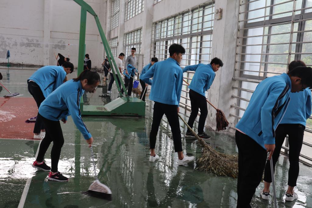 本网讯(交通运输学院 阮露)为迎接“五一”国际劳动节的到来,4月27日下午,交通运输学院组织空中乘务、城市轨道交通运营管理专业学生在校体育馆开展“我爱我家、干净过五一”大扫除。
