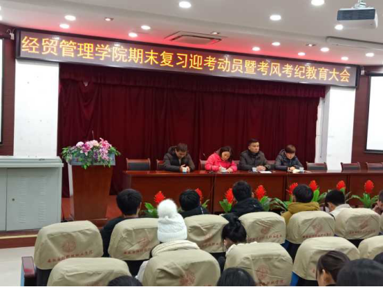 为做好期末复习迎考工作,严肃考风考纪。1月2日晚,经贸管理学院图书馆报告厅召开了期末复习迎考暨考风考纪教育大会,院党总支书记杜先扬老师、辅导员许凤麟老师、辅导员张锐老师及各班学生代表共200人参会。大会由团总支书记付玉梅老师主持。