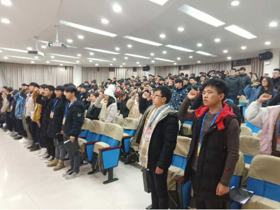 在诚信考试宣誓环节中,与会同学纷纷起立举起右拳庄严宣誓:用我的认真努力,积极复习迎考;用我的自觉自律,维护考场纪律;用我的自尊自爱,参与公平竞争;用我的人格名誉,拒绝违纪作弊!