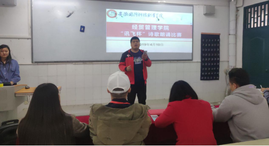 本网讯 为做好第十四届“讯飞杯”诗歌朗诵比赛的前期选拔工作,2019年4月10日下午,经贸管理学院诗歌朗诵院级选拔赛在2教103教室隆重举行。经贸管理学院团委书记付玉梅及院团总支学生会主席团成员担任了本次比赛评委。