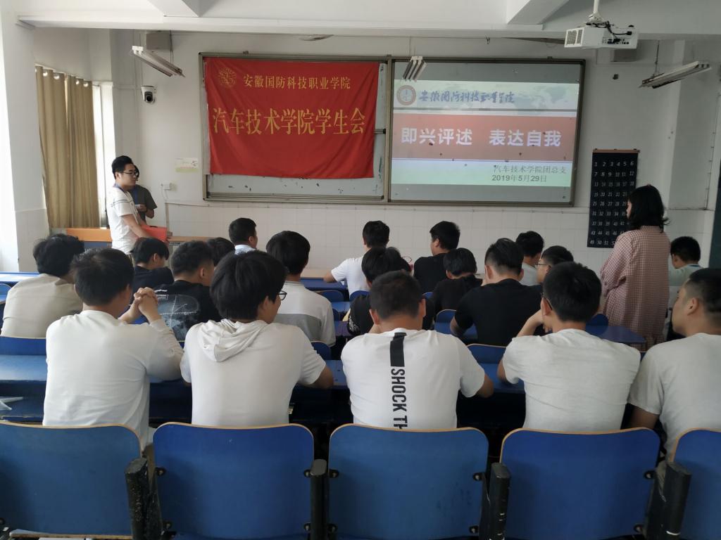 本网讯(汽车技术学院 黄世超)为提高学院同学们的语言组织和表达能力,丰富同学们的校园文化生活,2019年5月30日中午,汽车技术学院团总支学生会在2教205开展了“即兴评述 表达自我”活动,汽车技术学院辅导员黄世超老师出席了本次活动。