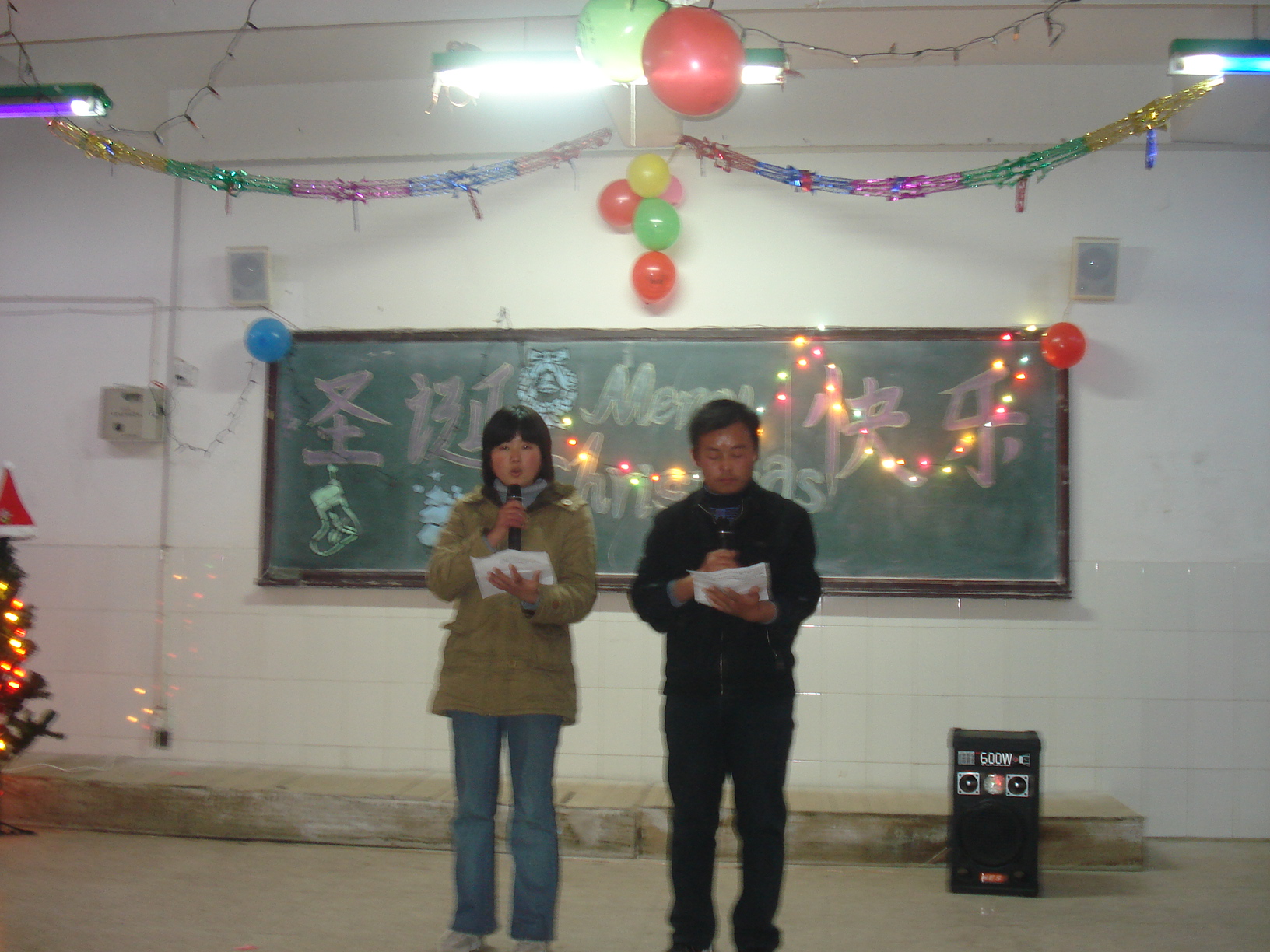 12 月25日晚,由基础部主办的、院英语协会承办的2009年圣诞晚会在一号教学楼211教室举行。晚会节目丰富多彩,其中英语节目占三分之二以上。英语协会全体会员及其他同学共90人参加晚会。