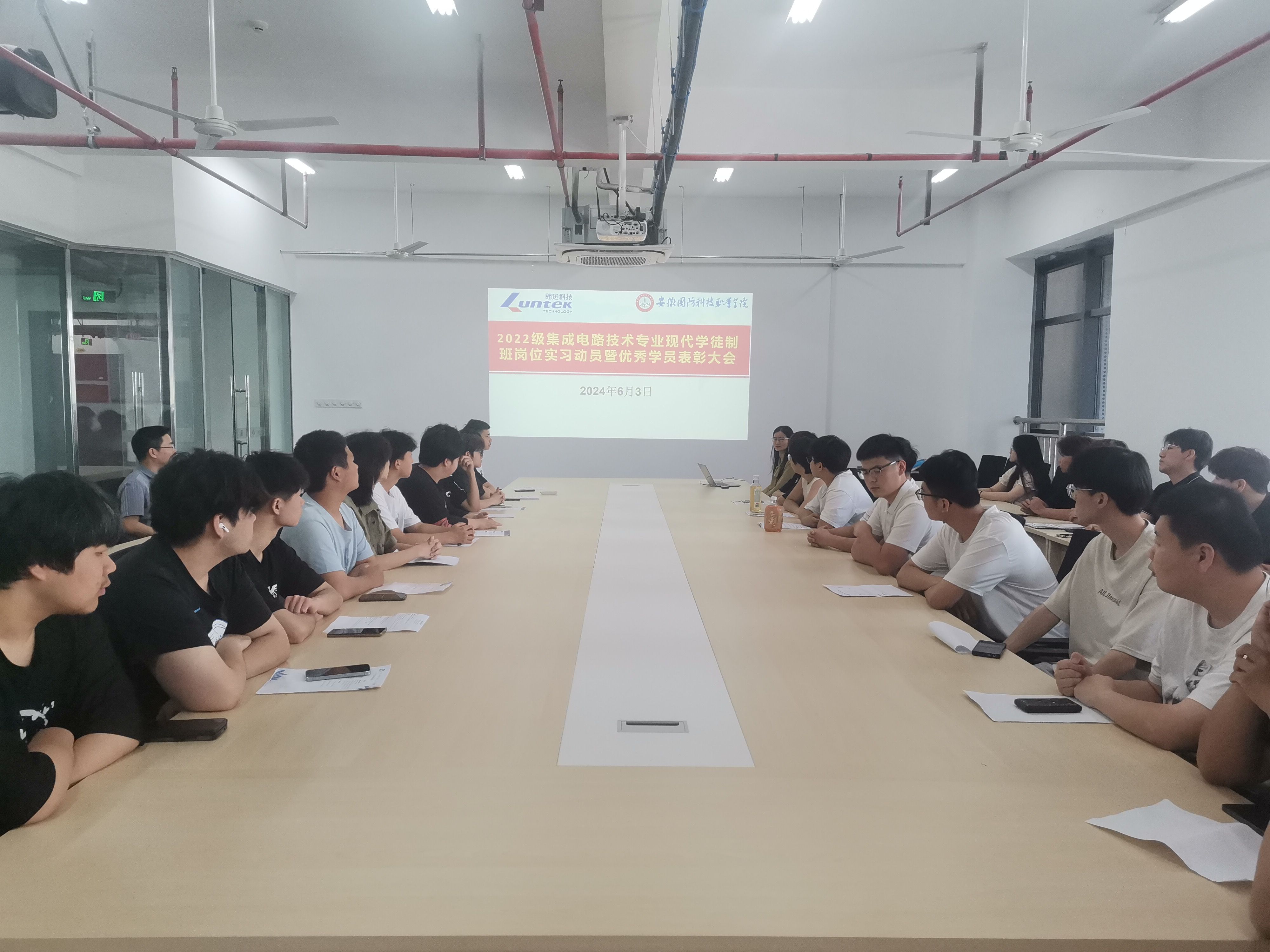 本网讯(电气技术学院 江治国)为落实做好2022级集成电路技术专业“朗迅”学徒制班岗位实习工作,6月3日,杭州朗迅科技股份有限公司来校开展岗位实习动员暨优秀学员表彰活动。朗迅公司崔晓阳经理、“朗迅”学徒制班全体学员及部分专业教师参加会议,会议由电气技术学院副院长江治国主持。