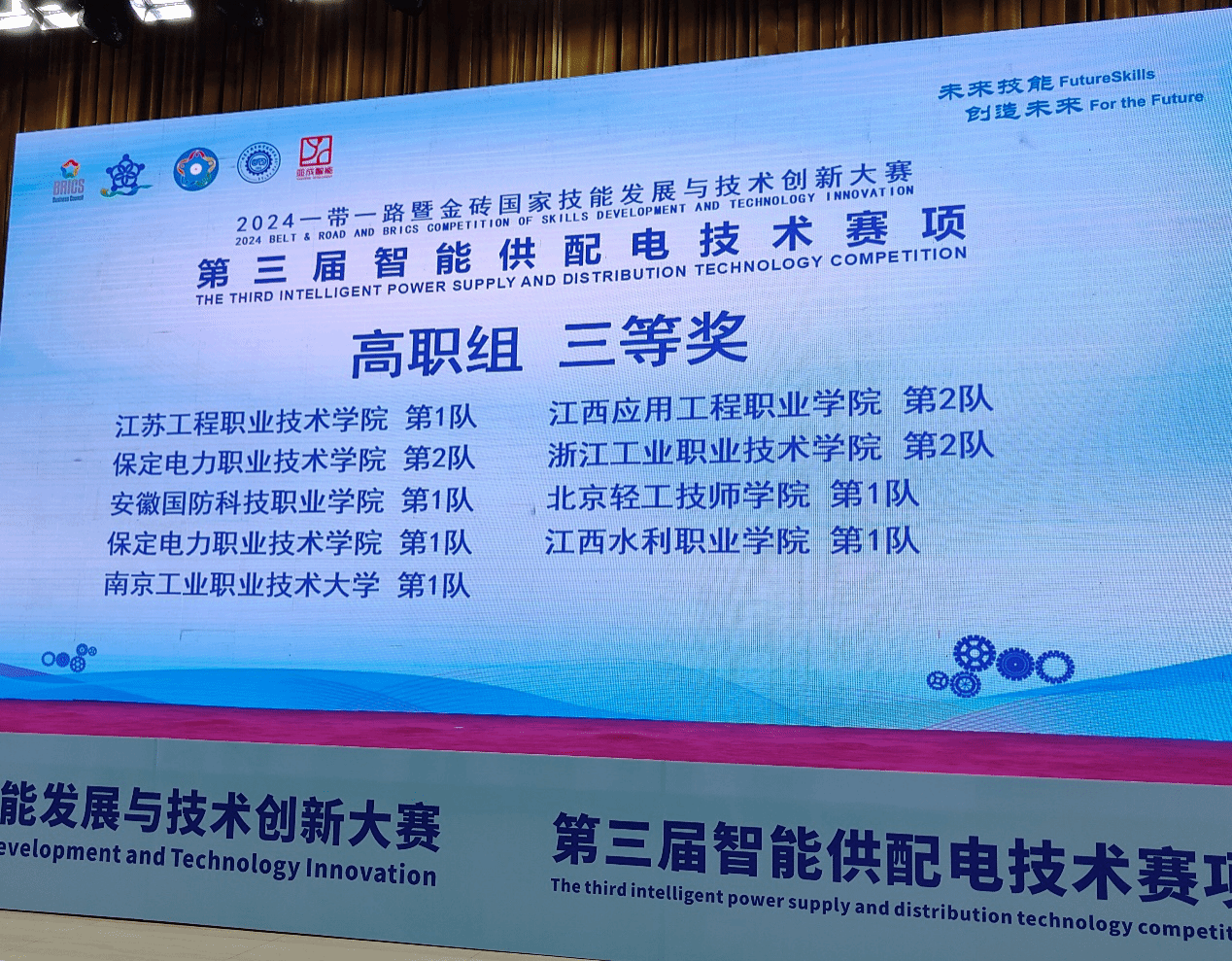 本网讯 9月19日-22日,由金砖国家工商理事会、一带一路暨金砖国家技能发展国际联盟、中国科协等单位共同主办的2024年“一带一路”暨金砖国家技能发展与技术创新大赛第三届智能供配电赛项在内蒙古机电职业技术学院成功举办,本次大赛有来自28个省、直辖市共110余支团队参加。经过初赛、决赛等竞赛环节,由电气技术学院侯超群等老师指导的信子恒、赵宇、谢钦锋团队在4天的激烈的竞争中脱颖而出,荣获全国总决赛三等奖。