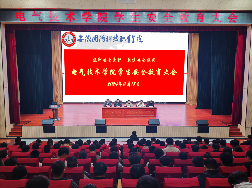 本网讯(电气技术学院 申晓伟)11月18日晚,电气技术学院在产教融合中心A座报告厅召开学生安全教育大会,传达学校安全工作会议精神,部署学院安全工作和消防安全宣传月活动,学院全体辅导员、班级主要学生干部和宿舍安全信息员(宿舍长)参加了会议。