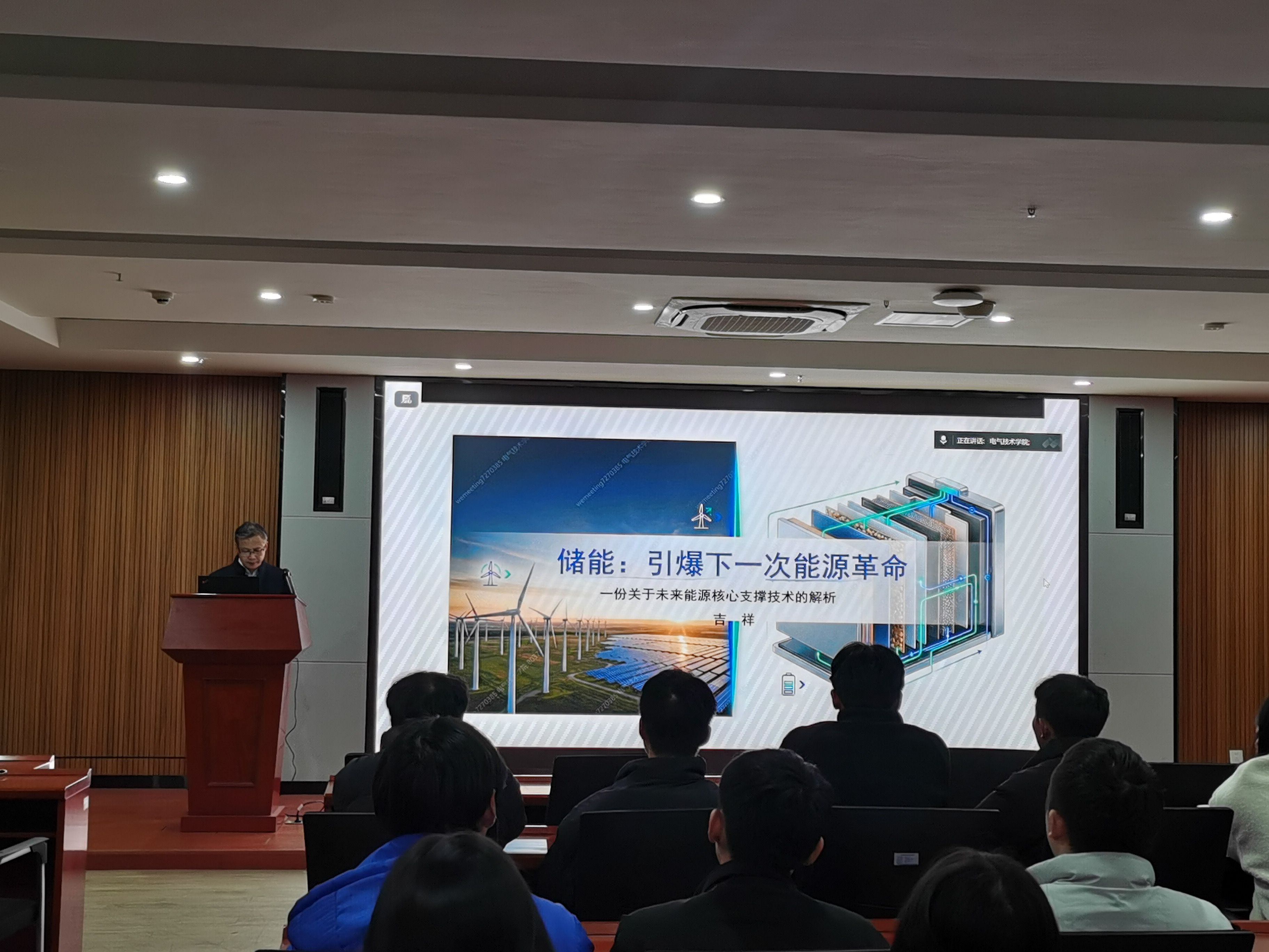 本网讯(电气技术学院 马骙)为搭建校企交流桥梁,帮助师生对接行业前沿,深化储能技术认知。12月16日,电气技术学院在产教融合第一报告厅成功举办储能技术知识讲座。本次讲座由学院院长李翔主持,特邀安徽锐能科技有限公司副总经理、高级工程师吉祥担任主讲嘉宾,24级、25级电气本科班全体学生及部分专业教师参会。