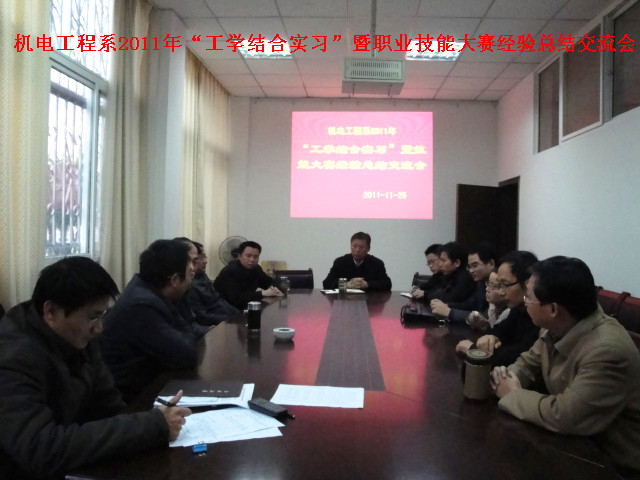 11月25日下午机电工程系在会议室召开“工学结合实习”暨职业技能竞赛经验总结交流会,会议由系主任陈小林主持,我系各教研室主任、各专业实训中心主任、“工学结合实习”指导教师、省级职业技能竞赛指导教师参加了会议。会上陈主任首先对我系09汽车类专业暑期赴芜湖奇瑞公司工学结合实习取得圆满成功和2011年我系在省、国家级职业技能大赛中取得优异成绩表示祝贺,接着各位“工学结合实习”指导教师总结分享了工学结合实习过程中的经验,指出存在的问题,为进一步做好工学结合实习工作提出许多宝贵的建议。各位职业技能大赛指导教师也纷纷发言,就如何选拔优秀的参赛选手、如何有效地进行大赛的培训工作、职业技能大赛的后勤保障工作等展开充分的讨论与交流,为下一步职业技能竞赛的开展提出了许多意见和建议。