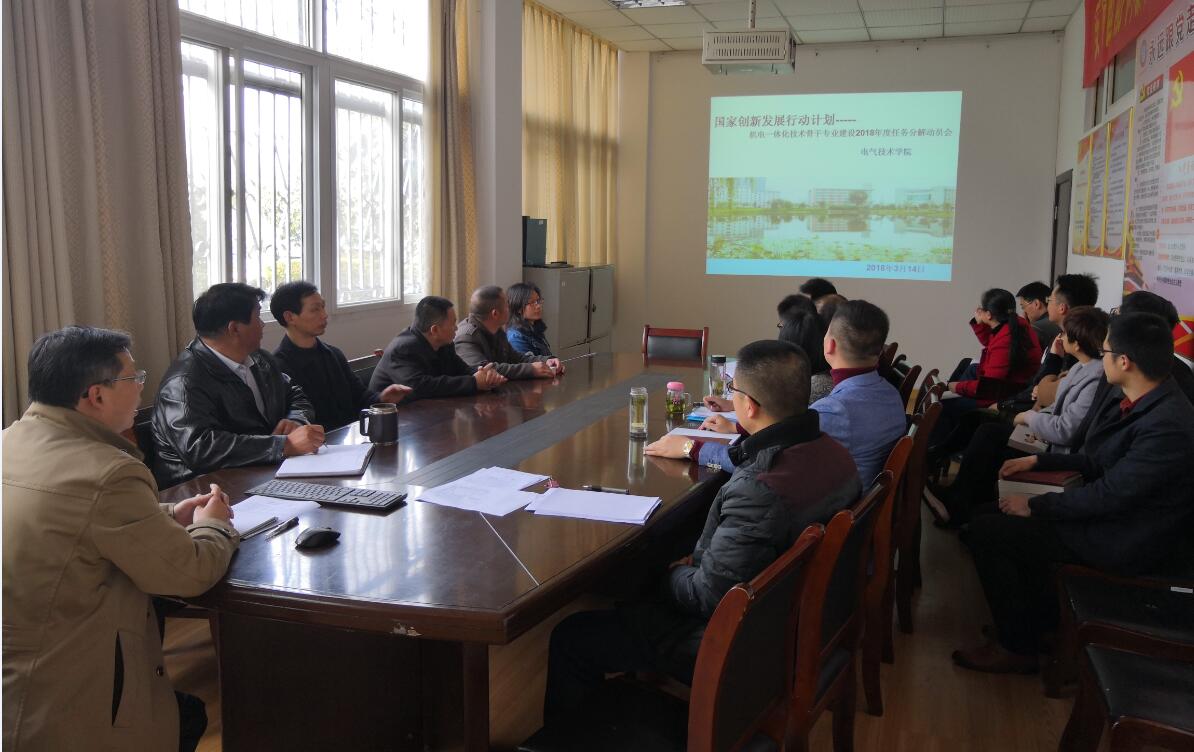 根据学校国家创新发展行动计划专业项目建设进度,3月14日下午两点半,电气技术学院组织召开了机电一体化技术骨干专业建设2018年度任务分解动员会,重点布置了2018年各项工作任务及分解落实工作。会议由电气学院院长李翔主持,全体教师参加了会议。