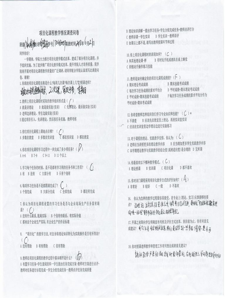 李院长首先介绍了课程改革的总体情况,展示项目化课程学生调查问卷结果;随后,各任课教师结合自己授课实际谈了自己的体会和建议。通过授课教师的总结和学生调查问卷结果显示,学生对项目化教学方式的评价非常好的达到61.8%、较好的达到37.1%,学生在项目化教学过程中积极动手操作练习技能的占到89.9%,学生和老师对项目化课程实施的有效性给予高度评价;最后结合项目化课程实施过程中存在的问题,李院长对项目总体设计调整、单元设计方案完善、课程任务书和项目化教材修改、完善和定稿等具体任务进行了分工。