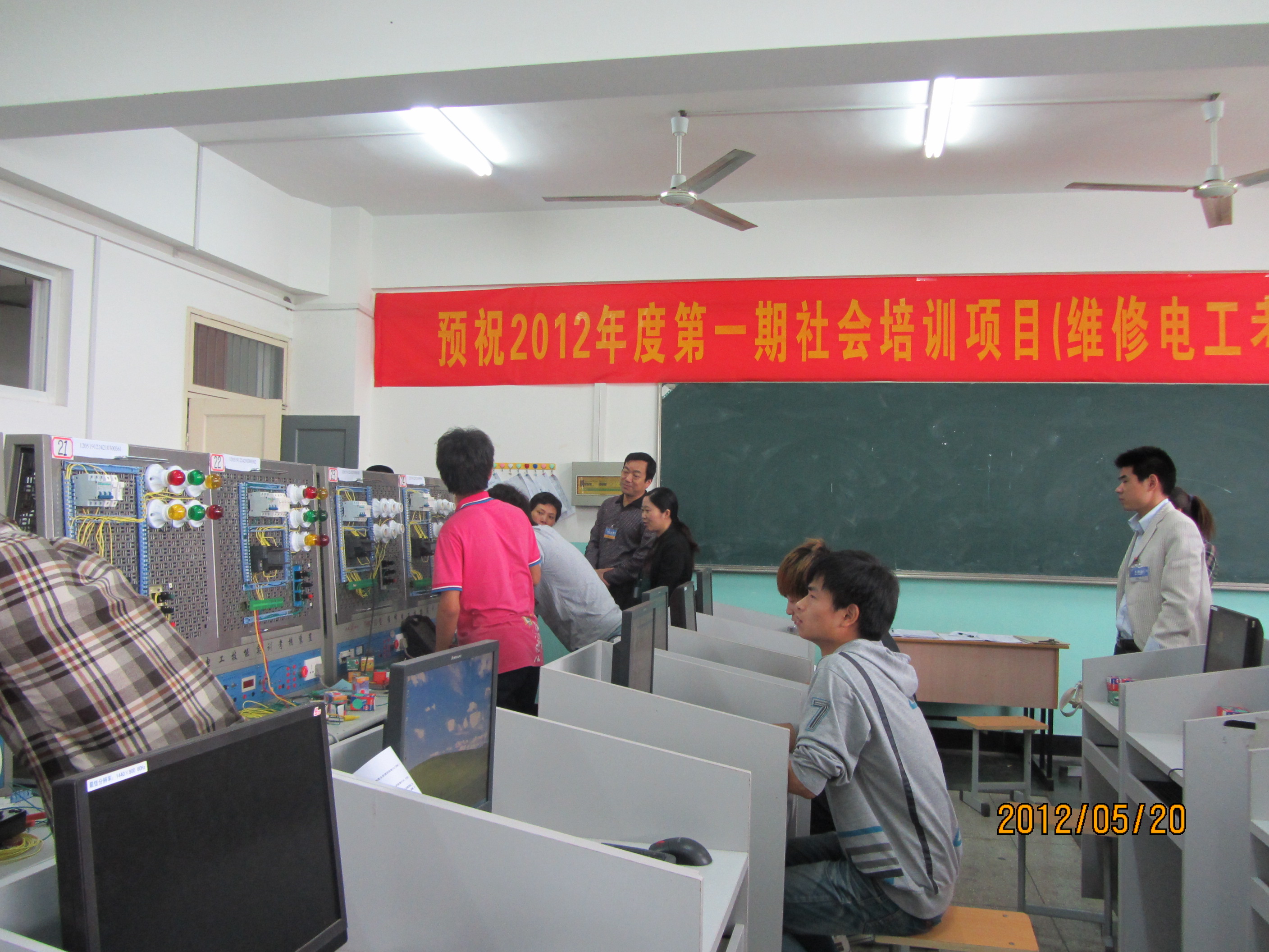 在经过前期各模块的紧张培训后,我系电工电子与自动化实训中心2012年度第一期社会培训项目(维修电工考证培训)于5月19/20日进行了维修电工(高级)的职业技能鉴定(考证)工作,此次考证列入安徽省统考范围,内容分为应知、应会两大模块,其中应会模块又分为十字路口调光灯PLC编程设计安装控制电路、变频器软启动控制电路故障排除、调光灯电子电路装调三个环节。本次鉴定工作在六安市职业技能鉴定中心的全程指导、组织和监控下开展;系实训中心在学院职业技能鉴定站的指导下考前精心准备,确保考证工作顺利实施;考评员认真负责、严格规范、任劳任怨,参考学员沉着冷静、认真操作、稳定发挥,鉴定工作获得了巡考领导的高度评价。