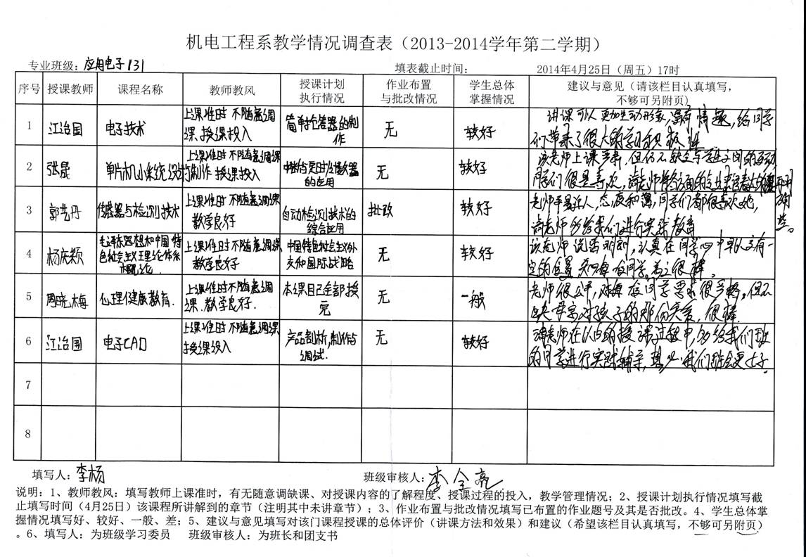 为配合2013-2014学年第二学期期中教学检查工作开展,切实摸清系属各班级教师教学履职情况和学生掌握情况,根据机电工程系教风、学风建设年实施方案和系督导学期工作计划安排,机电工程系于201442325日成功组织开展了2013-2014学年第二学期期中教学情况调查专项活动,各班学习委员在征求班级全体同学意见的基础上,会同班长、团支书认真填写了教学情况调查表,调查表格填写详实具体,并全部按时收回。