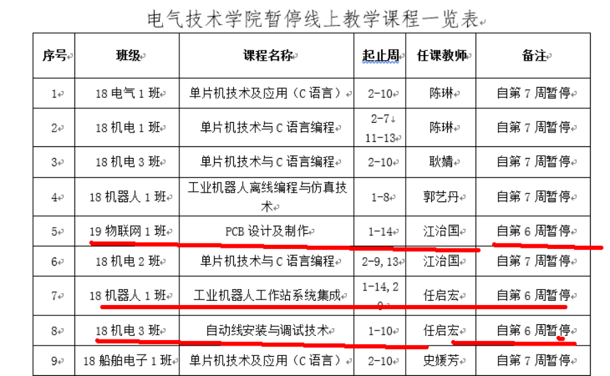 1、本周根据电气技术学院课程调整计划,共有江治国老师和任启宏老师3门课程停课,停课的课程信息如下: