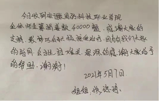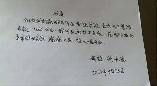 电气技术学院全体教职工积极响应,纷纷伸出援助之手,并通过辅导员和班主任传达对张梦巧同学的关心和祝愿。随后向全校教师发出了捐款“倡议书”,各二级学院党总支和直属党支部也纷纷组织捐款,学院团总支也通过各二级学院团总支向学生发出了倡议,全校师生捐款的热情很高。截止到2021年5月31日,共募集49566.64元,善款已经分两次转交给了学生的家人。