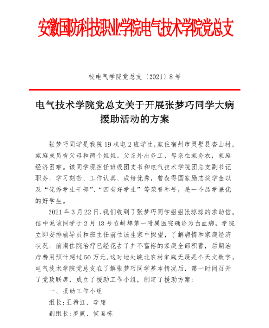 3月31日,学院党总支制定了《电气技术学院党总支关于开展张梦巧同学大病援助活动的方案》(校电气学院党总支[2021]7号),对具体的工作进行了分工,在组织捐款活动的同学,要求其班级的授课教师积极为该生开展线上教学和辅导答疑,确保张梦巧同学按时完成学业。