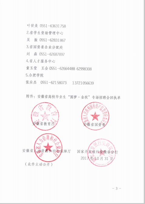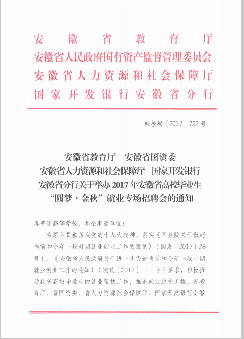 现将省教育厅《举办2017年安徽省高校毕业生“圆梦 金秋”就业专场招聘会的通知》(皖教秘[2017]722号)通知转发给你们。请各班级认真摸查尚未落实顶岗实习与就业单位学生信息,特别是就业困难毕业生就业工作,按要求做好精准岗位信息推送,做到精准帮扶,精准助困,帮助他们尽快实现就业。若需参加此次专场招聘会的,请各班级将名单报送至就业指导老师处,由就业指导老师带队参加。特此通知。