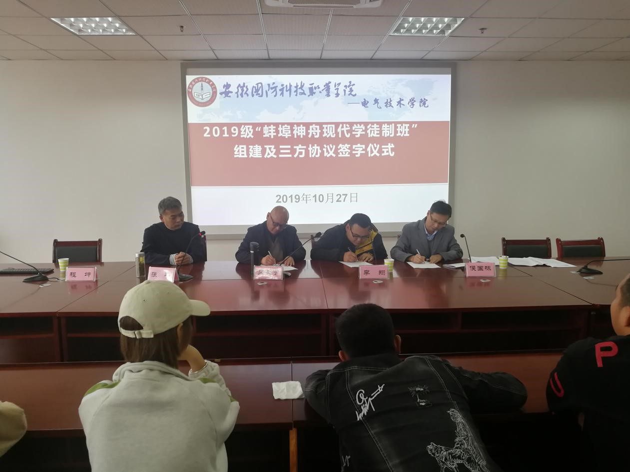 为深化教育教学改革,改进人才培养模式,促进校企合作、校企融合共同开展人才培养,增强人才培养工作的针对性和实效性,提高毕业生的就业竞争力和就业质量,2019年10月26日上午,电气技术学院院长李翔、蚌埠市神舟机械有限公司副总经理吴长宁及beat3652019级船舶电气工程技术专业学生,在秉心楼九楼会议室共同签订了2019级《蚌埠神舟现代学徒制班三方协议》,会议由电气技术学院副院长侯国栋主持。