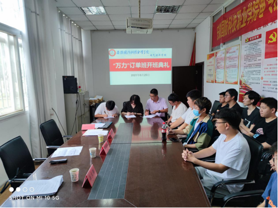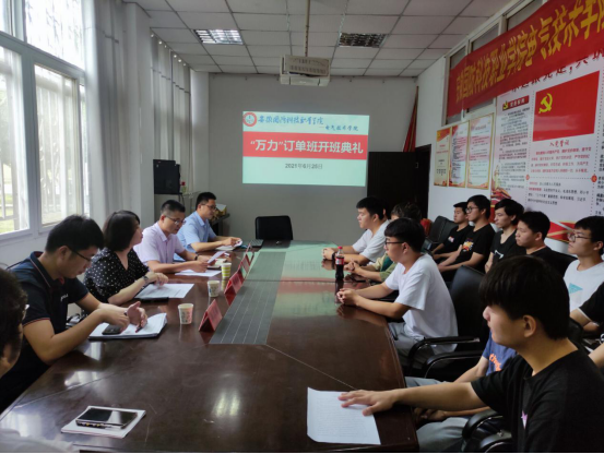 2020级“万力班”订单班在完成学生自愿报名、现场参观以及企业面试等前期工作的基础上,2021年6月26日下午15:00,校企双方在知行楼102会议室隆重举行“万力班”开班典礼。出席开班典礼的校企双方领导有电气技术学院副院长李侯国栋、万力轮胎有限公司人力资源部部长程婧娴、招聘专员岳立强、电气技术学院辅导员陈俊以及20级“万力班”全体同学。本次典礼由辅导员陈俊主持。