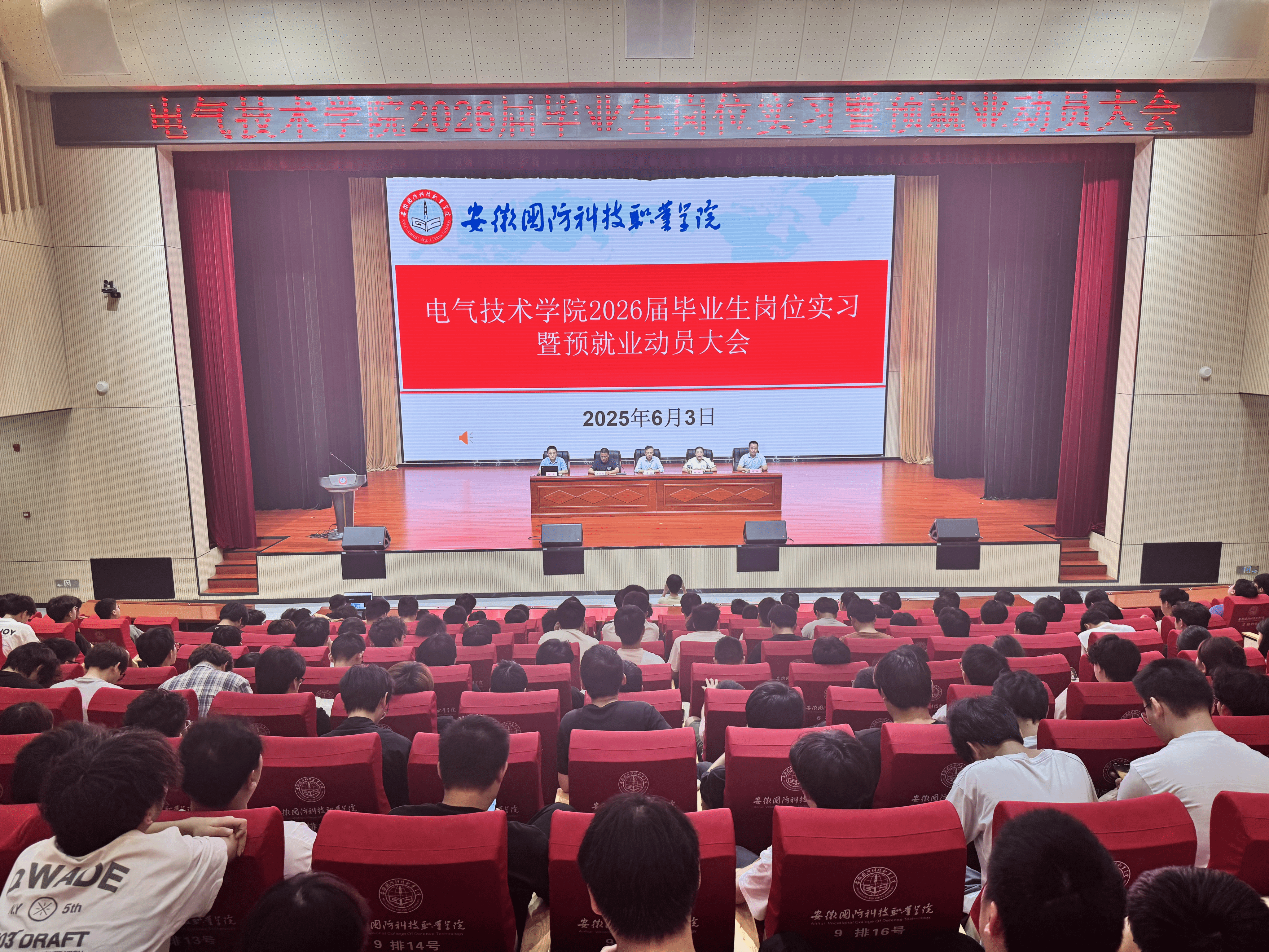 本网讯 为切实推进电气学院2026届毕业生岗位实习工作,引导学生认识岗位实习的重要性,强化学生安全意识,6月3日晚,电气技术学院在产教融合中心多功能报告厅召开了2026届毕业生岗位实习暨预就业动员大会。电气技术学院党政班子成员及23级全体师生参加了动员大会,动员大会由副院长江治国主持。