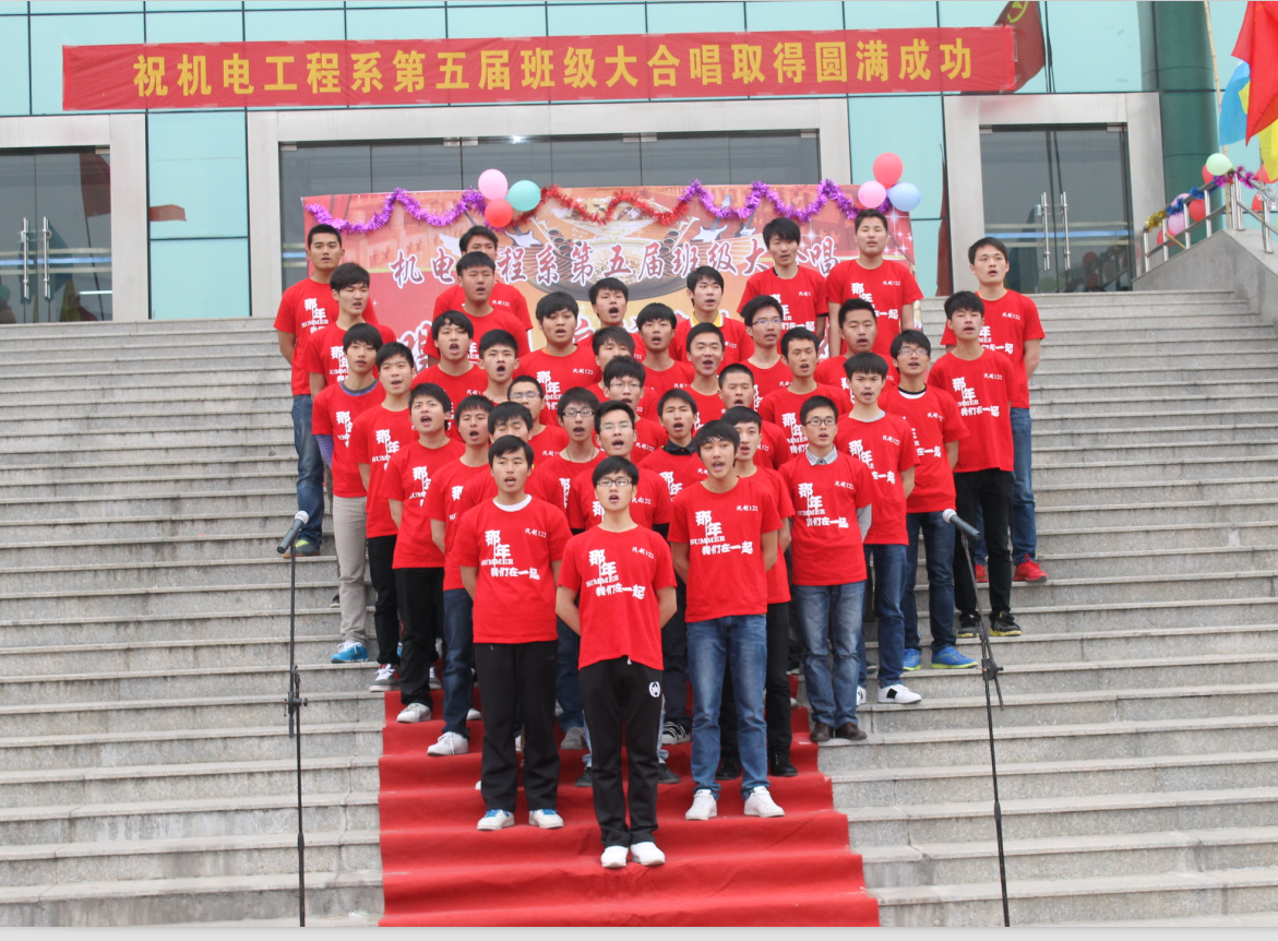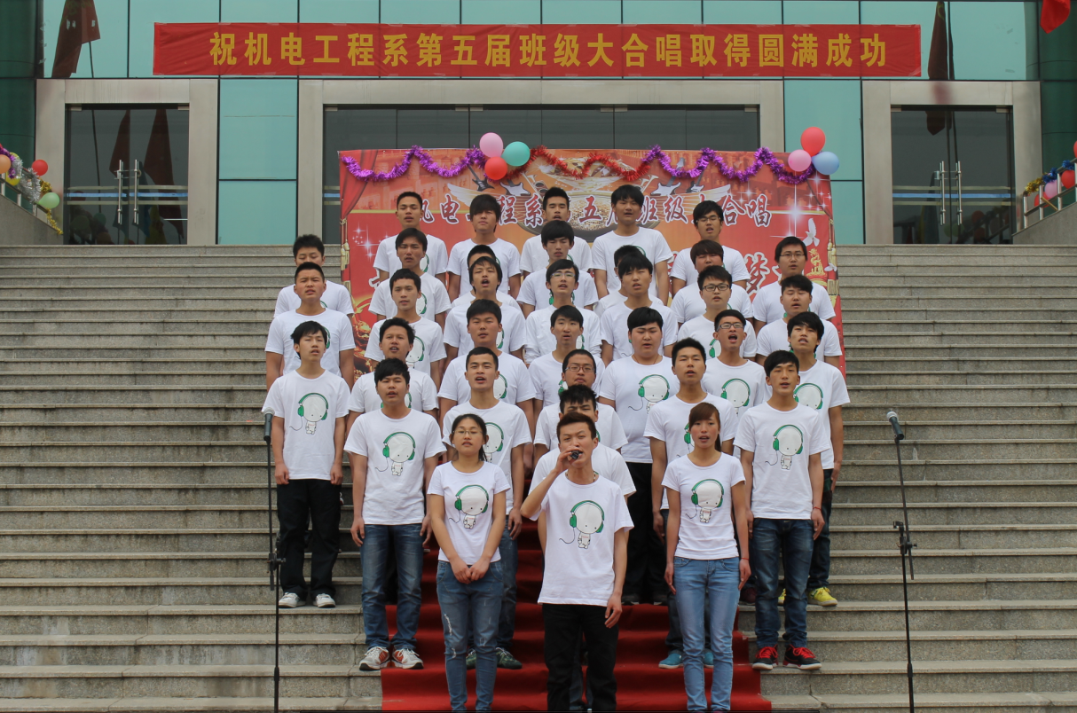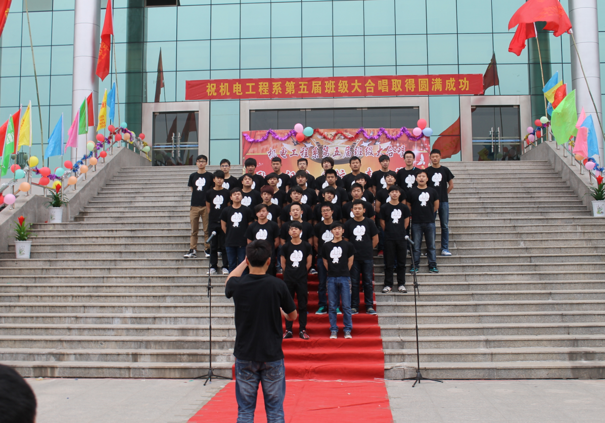为迎接第53个“五四”青年节的到来,丰富校园文化生活,增强学生的爱国热情、振兴中华的责任感和班级的团队精神。4月20日下午,机电工程系在学院图书馆前隆重举办“歌唱祖国 启航青春的梦想”第届班级大合唱比赛,本次比赛采用机电工程系项目化管理模式进行12级17个班级组成16支队伍分成A、B两个项目组进行,取每组前为获胜班级