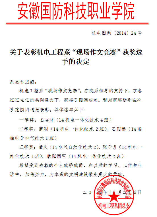 关于表彰机电工程系“现场作文竞赛”获奖选手的决定